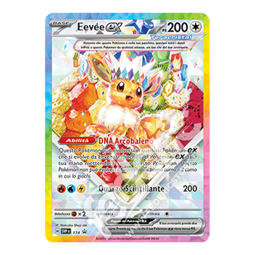 All’interno troverai una carta promozionale in stile rara illustrazione speciale di Eevee in veste di Pokémon-ex Teracristal Astrale, pronto a evolversi grazie alla sua abilità DNA Arcobaleno.